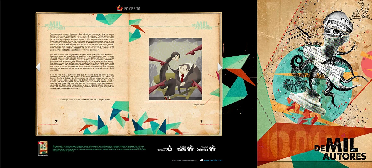 En el año 2013 construimos la plataforma llamada De Mil Autores, un libro virtual lanzado junto al equipo de En Órbita en el formato crossmedia en la feria internacional del libro de Bogotá 2013 donde se destaca la creación colectiva.